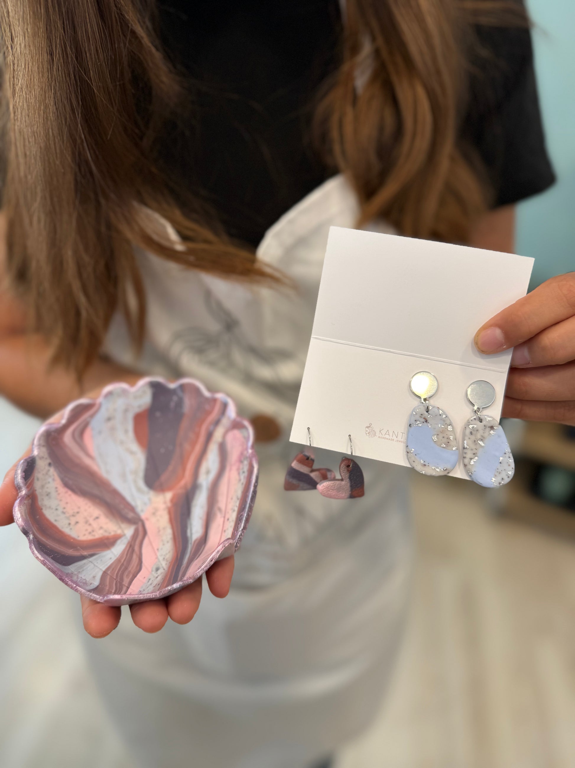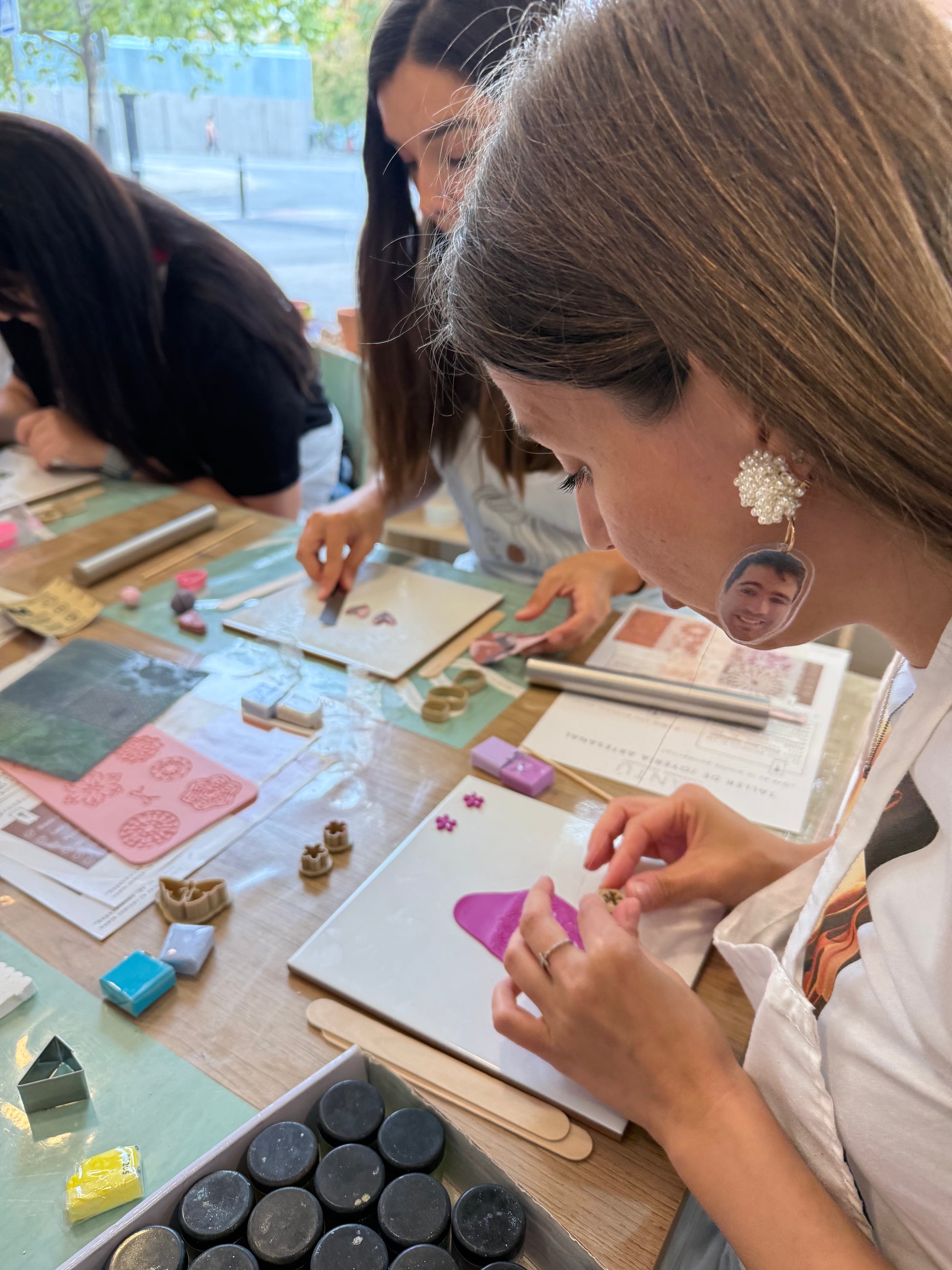 En este taller aprenderás a diseñar y crear dos pares de pendientes de arcilla polimérica y un joyero artesanal a juego, mientras disfrutas de un ambiente acogedor con vino, café y un delicioso aperitivo. 🥂