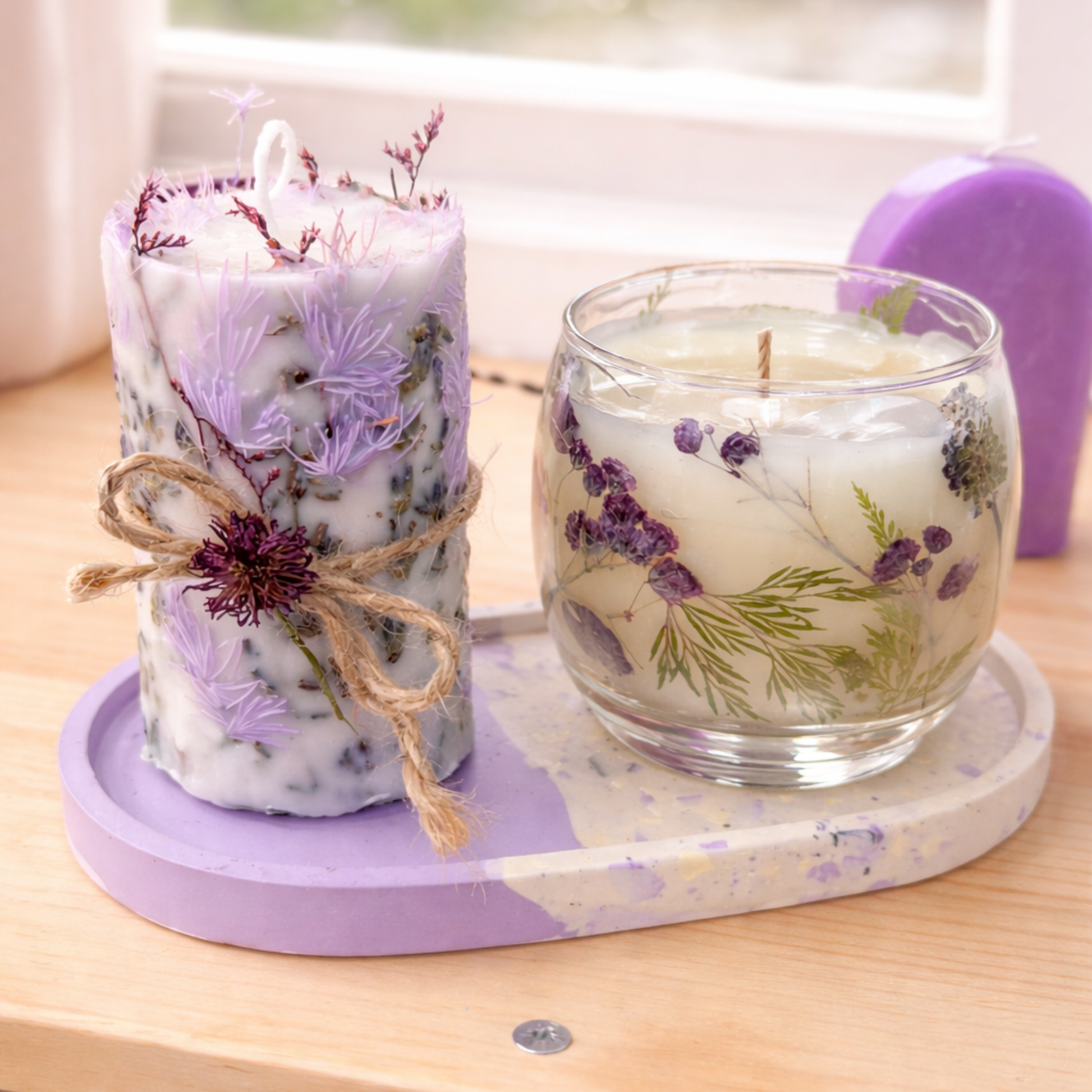 • Una vela cilíndrica donde aprenderás a incrustar flores secas dentro de la cera, creando un diseño floral único.